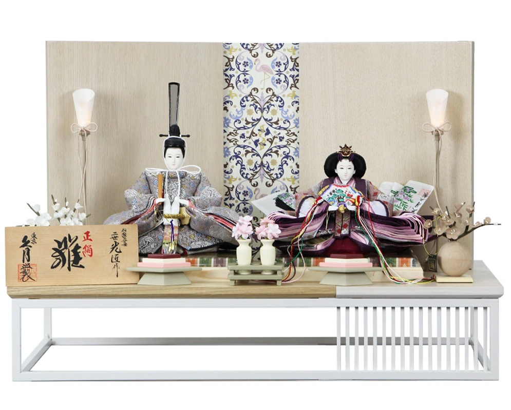 台座には明るい色味の木台を使用し、圧迫感のない軽やかな印象に。 準備や片付けも簡単な親王飾り(二人飾り)なので、忙しいママにも嬉しい設計です。 季節のインテリアとして楽しみながら、大切なお子様のお祝いをしませんか。