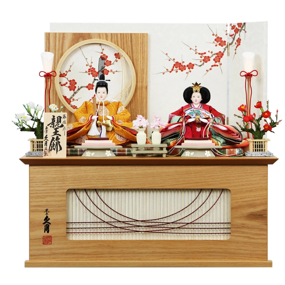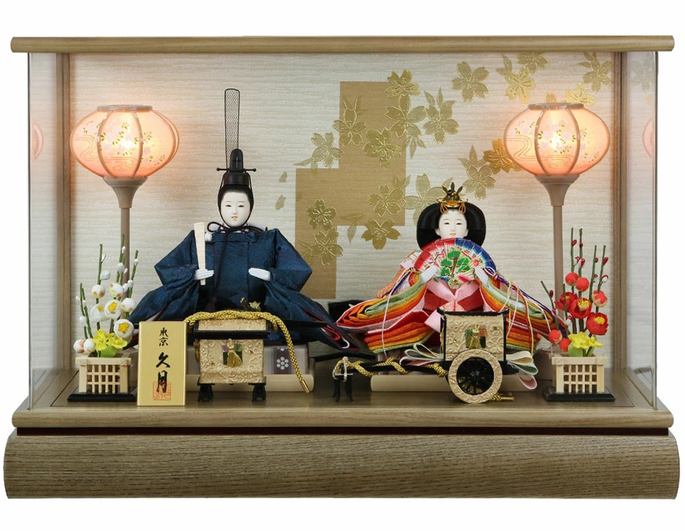人形の久月が贈る、現代の住空間に調和する美しい親王飾りです。 ケースの枠には、洋間やリビングにも違和感なく溶け込む、明るくナチュラルな木目調を採用しました。