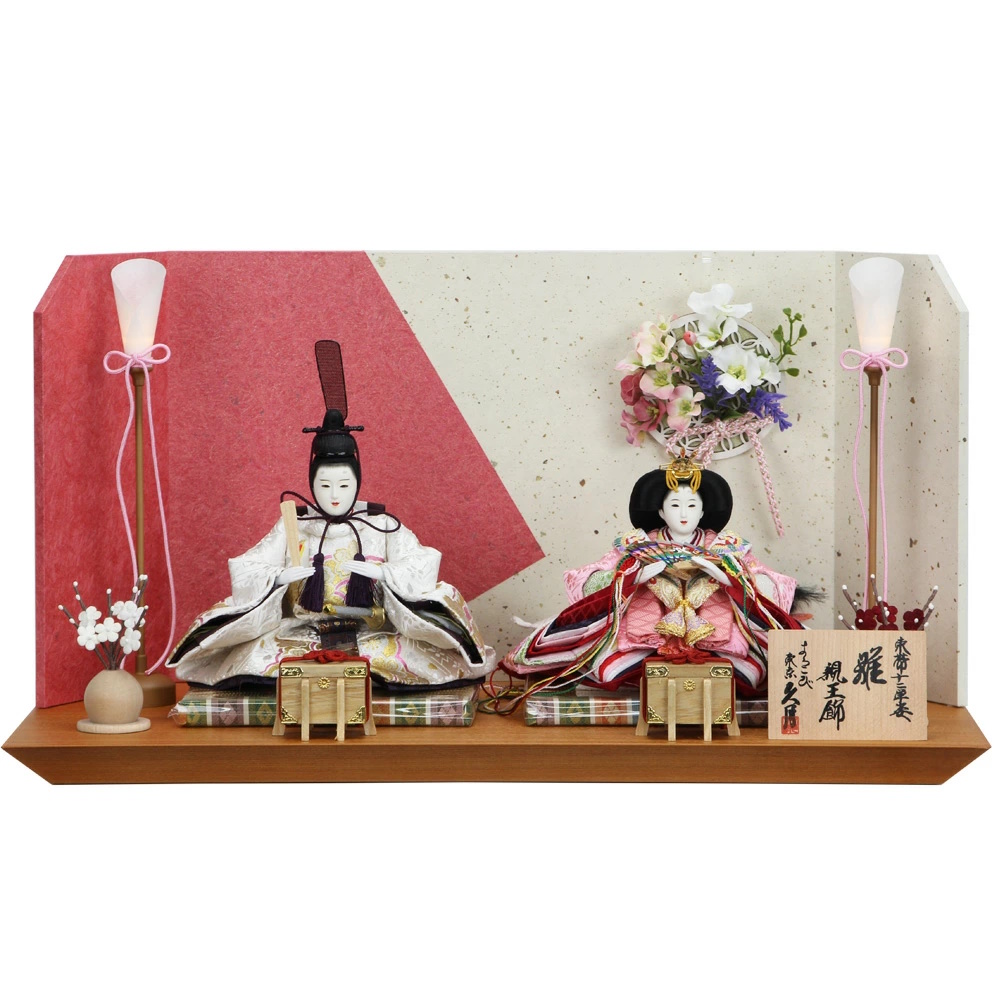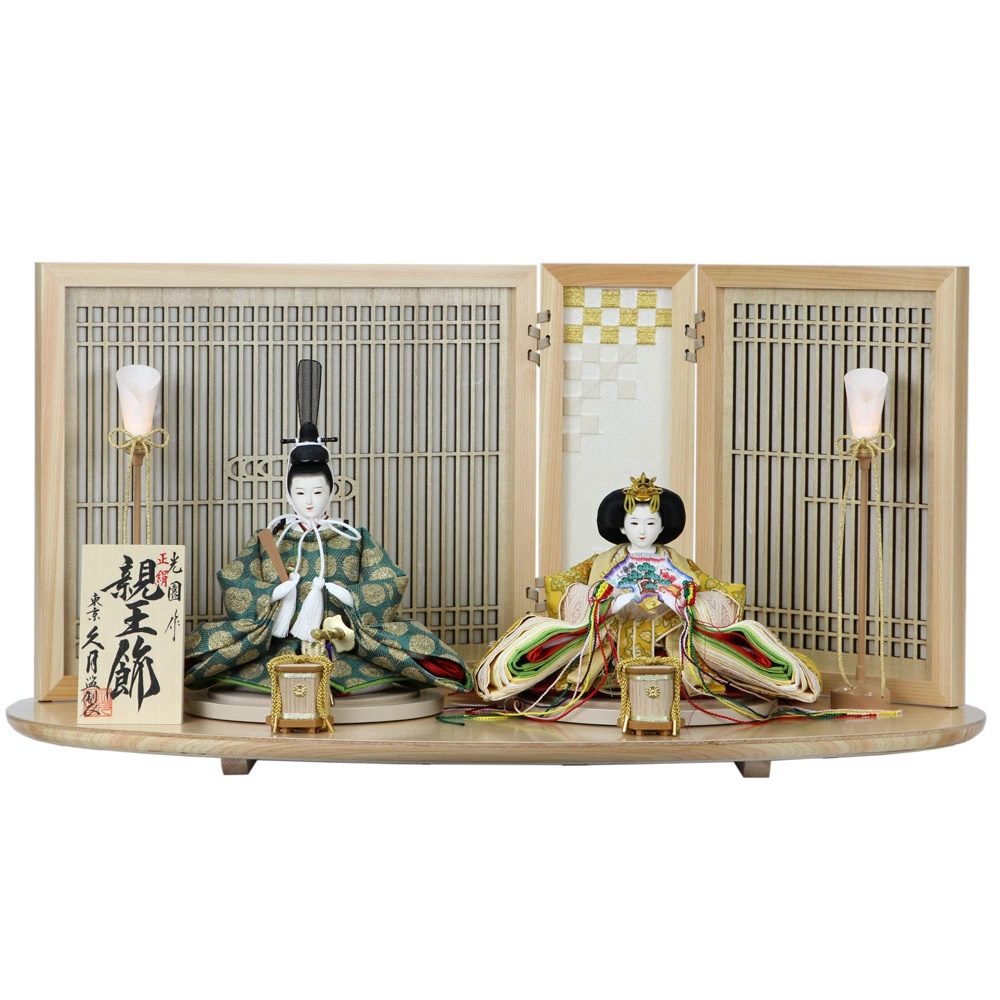 親王飾りは、「殿」と「雛」の二つの人形が一つのペアになったひな人形です。一般的に「殿」と「雛」を中心に飾り、「屏風」「雪洞」「三宝菱台」「桜橘」を飾ります。殿は向かって左に置き、姫を向かって右に置いて飾ります。しかし、その逆に飾る地域もあります。