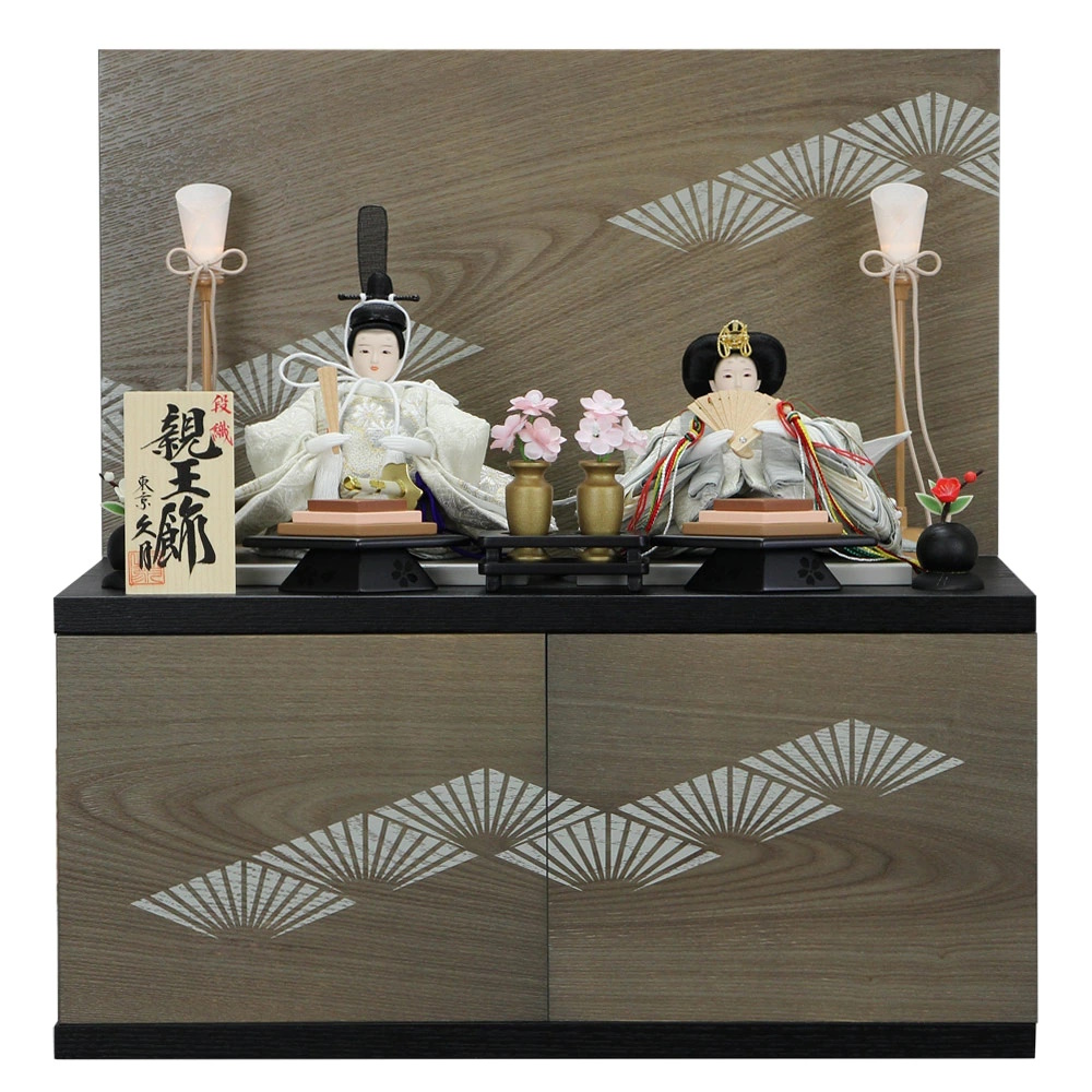《久月 雛人形 親王飾り 木目グレー松蒔絵収納飾り 段織白灰雪輪衣装 柳親王》
