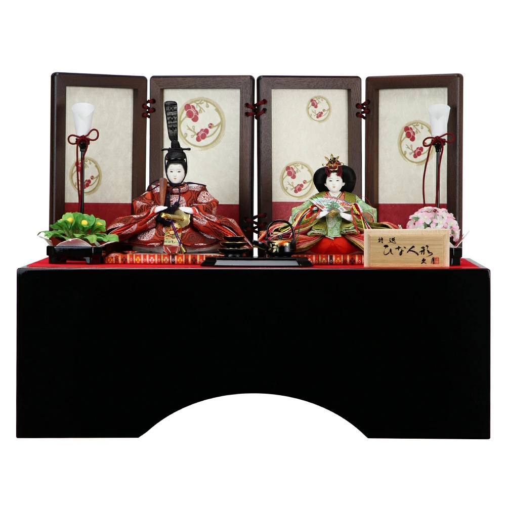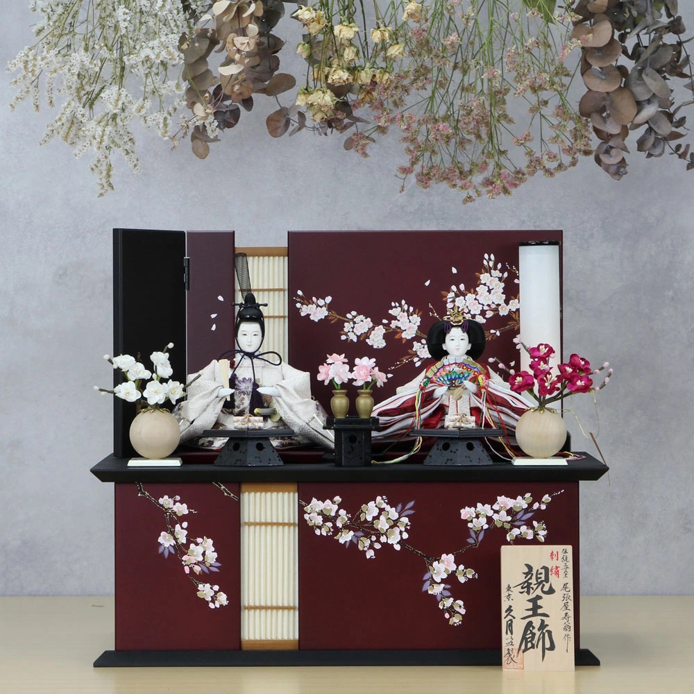 久月の人気の収納飾り「色舞シリーズ」の親王飾りです。作家は二世 光匠です。京十三番親王という こぶりな作りとなっていますが、上等な生地を使った高級な仕上がりとなっています。早春に咲く「紅梅」の花をイメージした配色にしました。