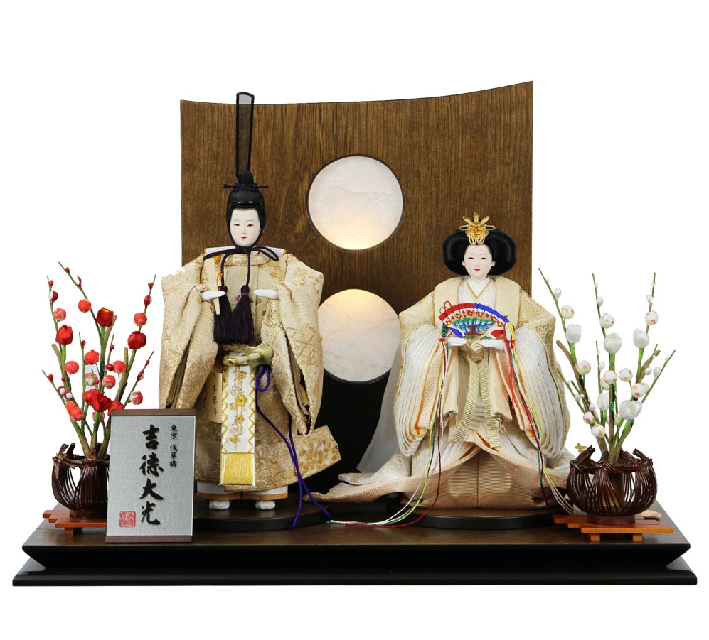 お殿様とお姫様の衣裳は、光の当たり方で表情を変える繊細な織柄。派手すぎず、洗練された「シャンパンゴールド」の色合いは、洋室のリビングにも、モダンな和室にも美しく調和します。 背景には、温かみのある木目の衝立を合わせ、満月を思わせる幻想的な円窓をデザイン。シンプルながらも奥行きのある空間を演出します。